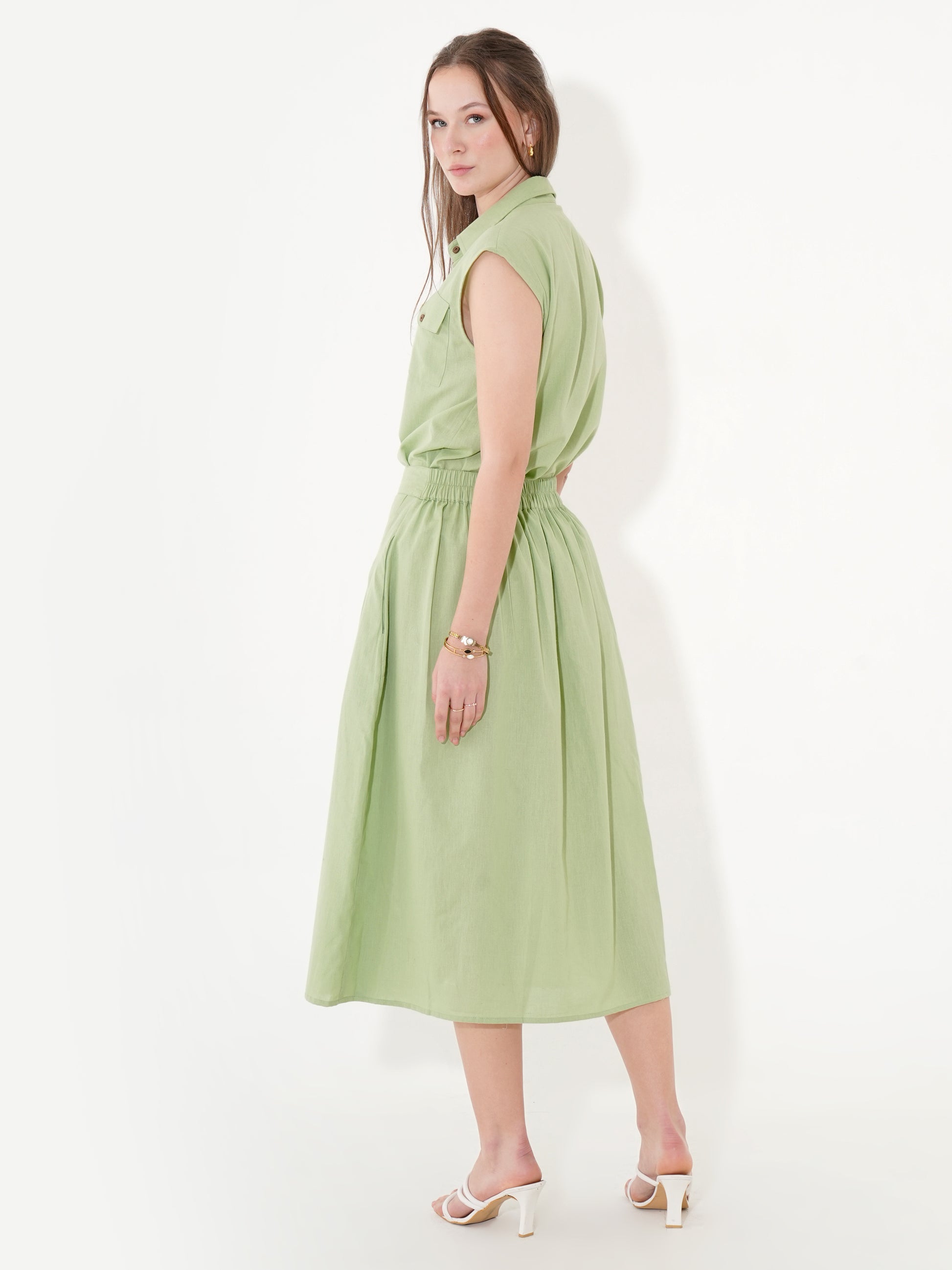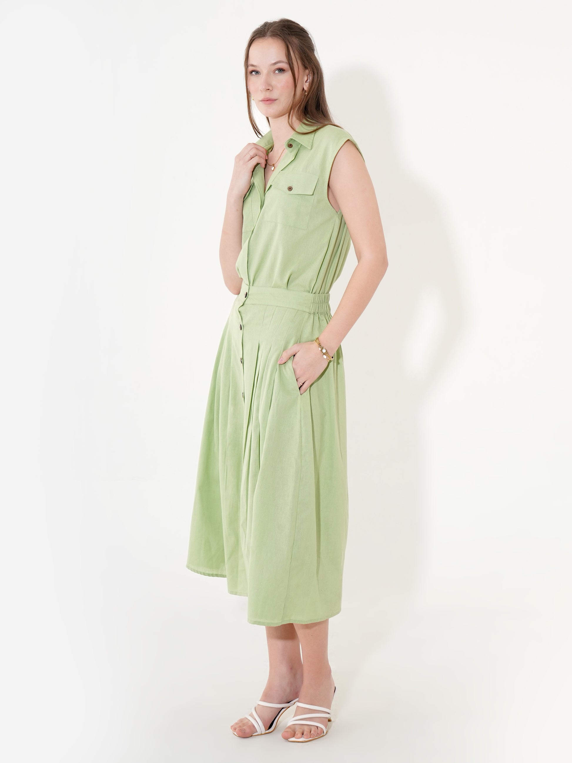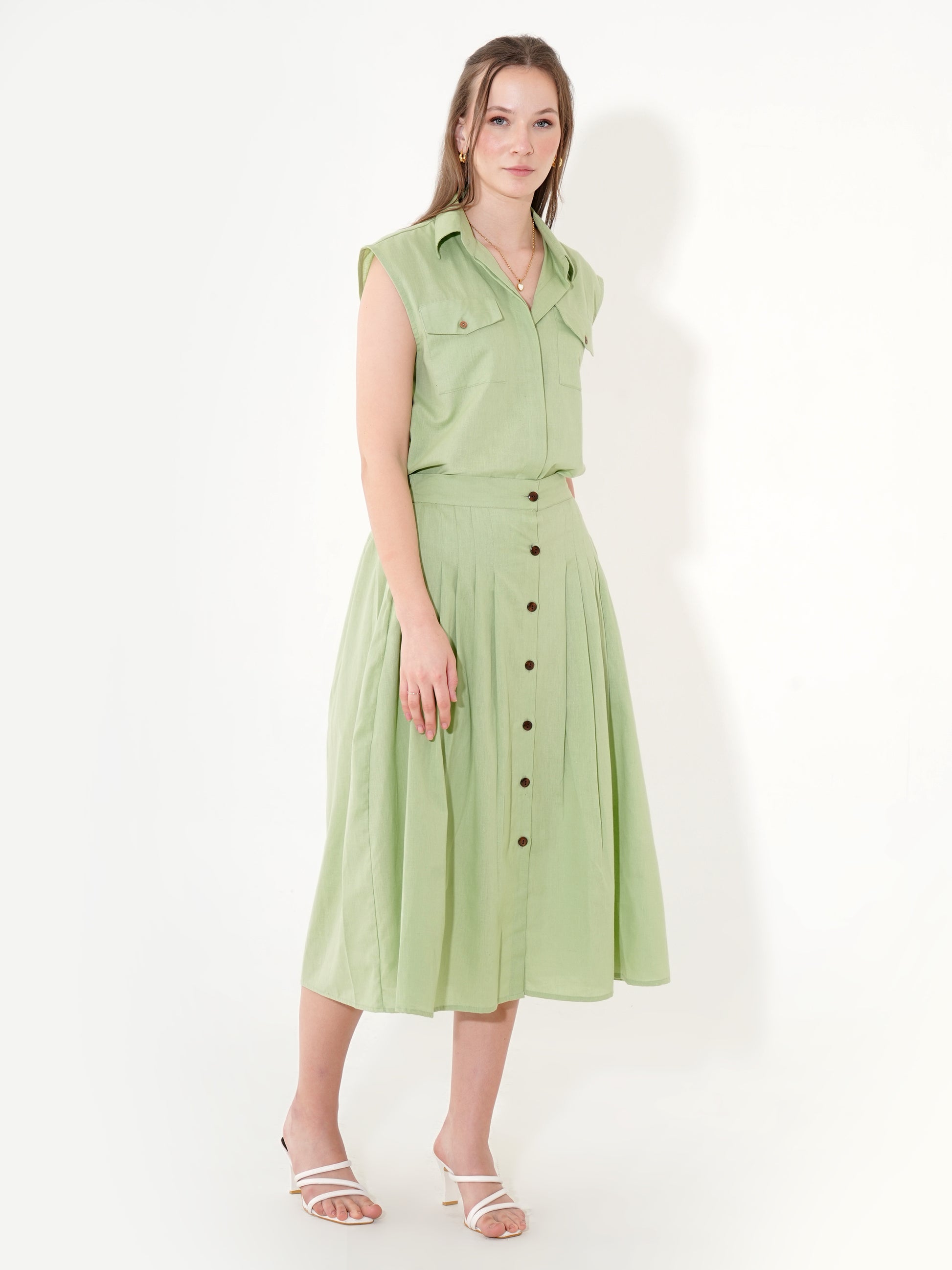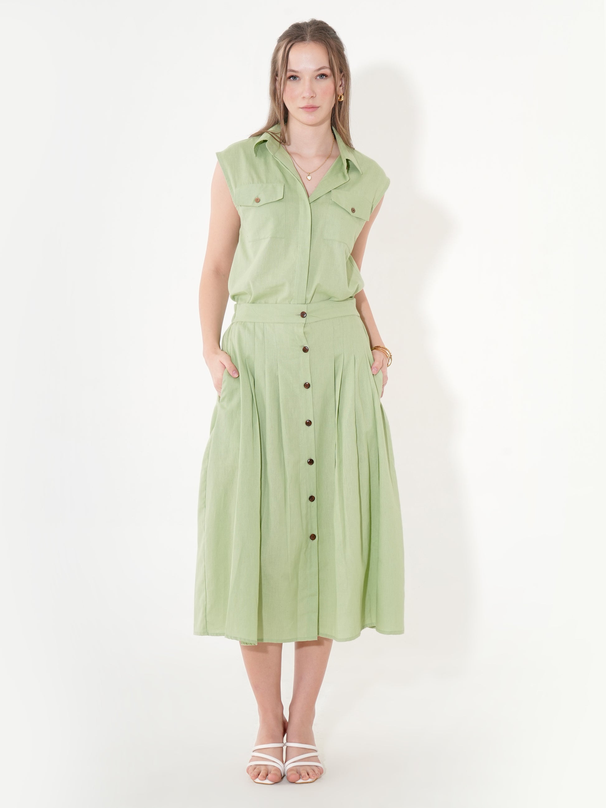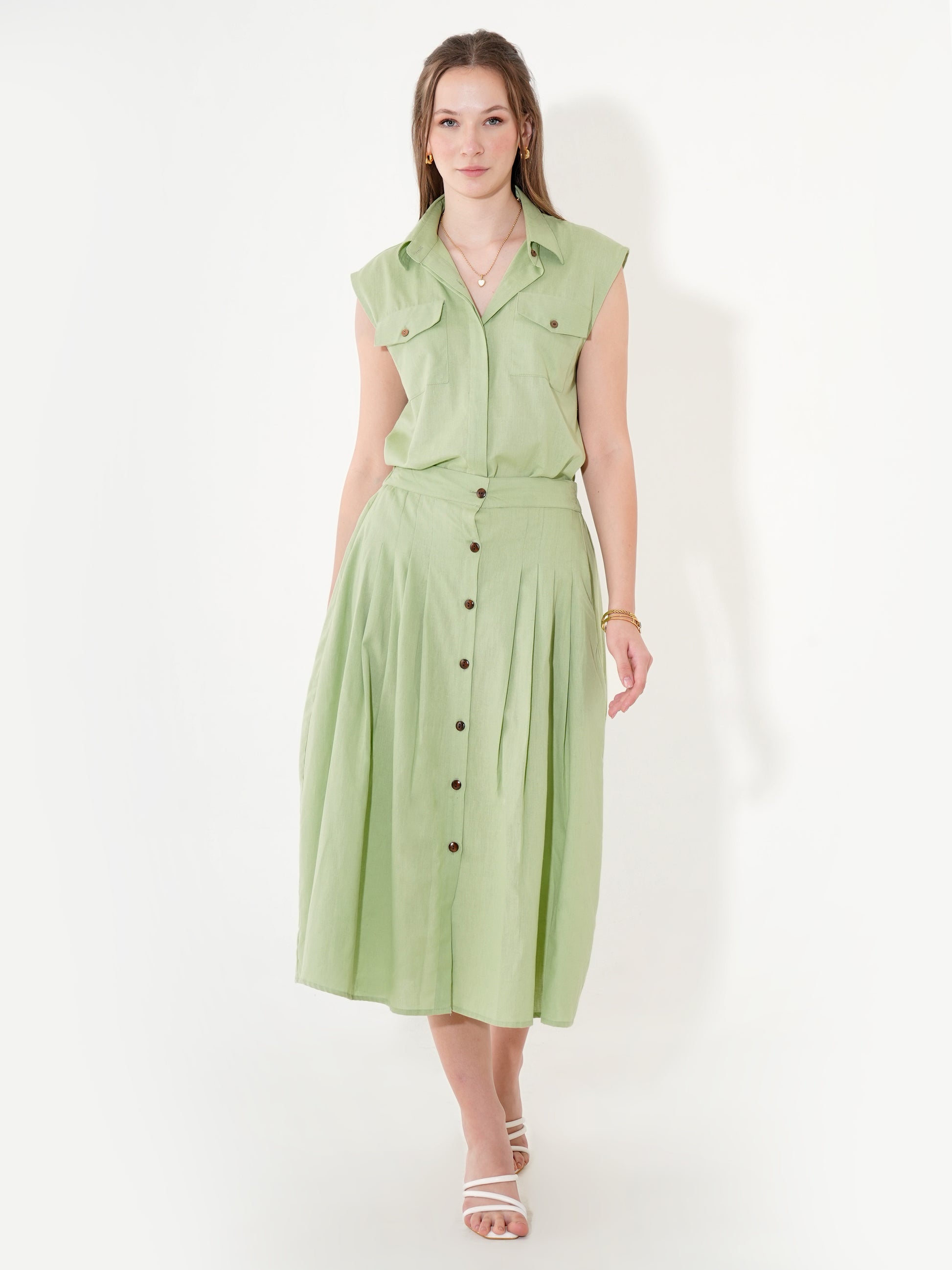A perfect blend of elegance and ease, the Cameo Coord Set is designed for effortless sophistication. Crafted from a linen blend, this set features a structured sleeveless button-up shirt with functional front pockets, paired with a high-waisted, pleated midi skirt for a refined yet breezy look. The soft peach hue enhances its timeless appeal, making it an ideal choice for both casual and elevated occasions.