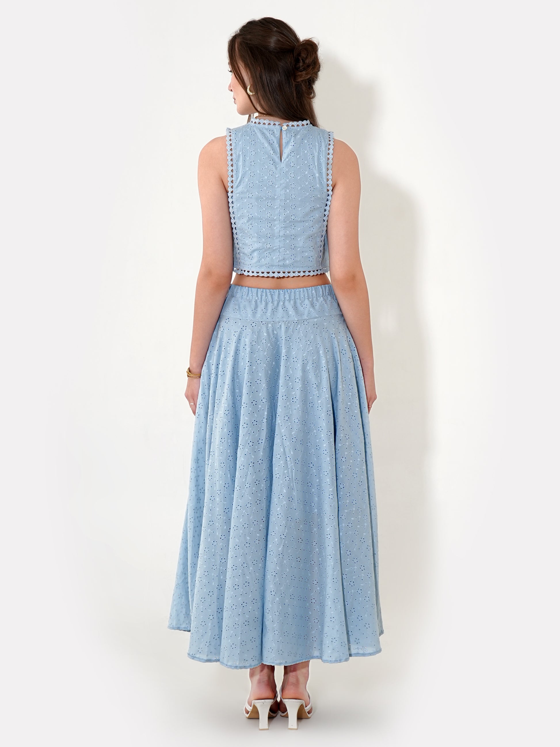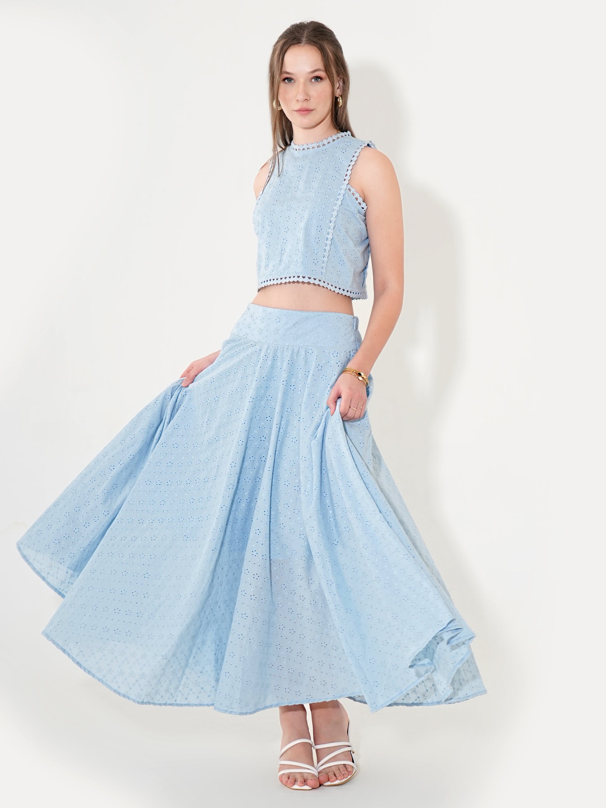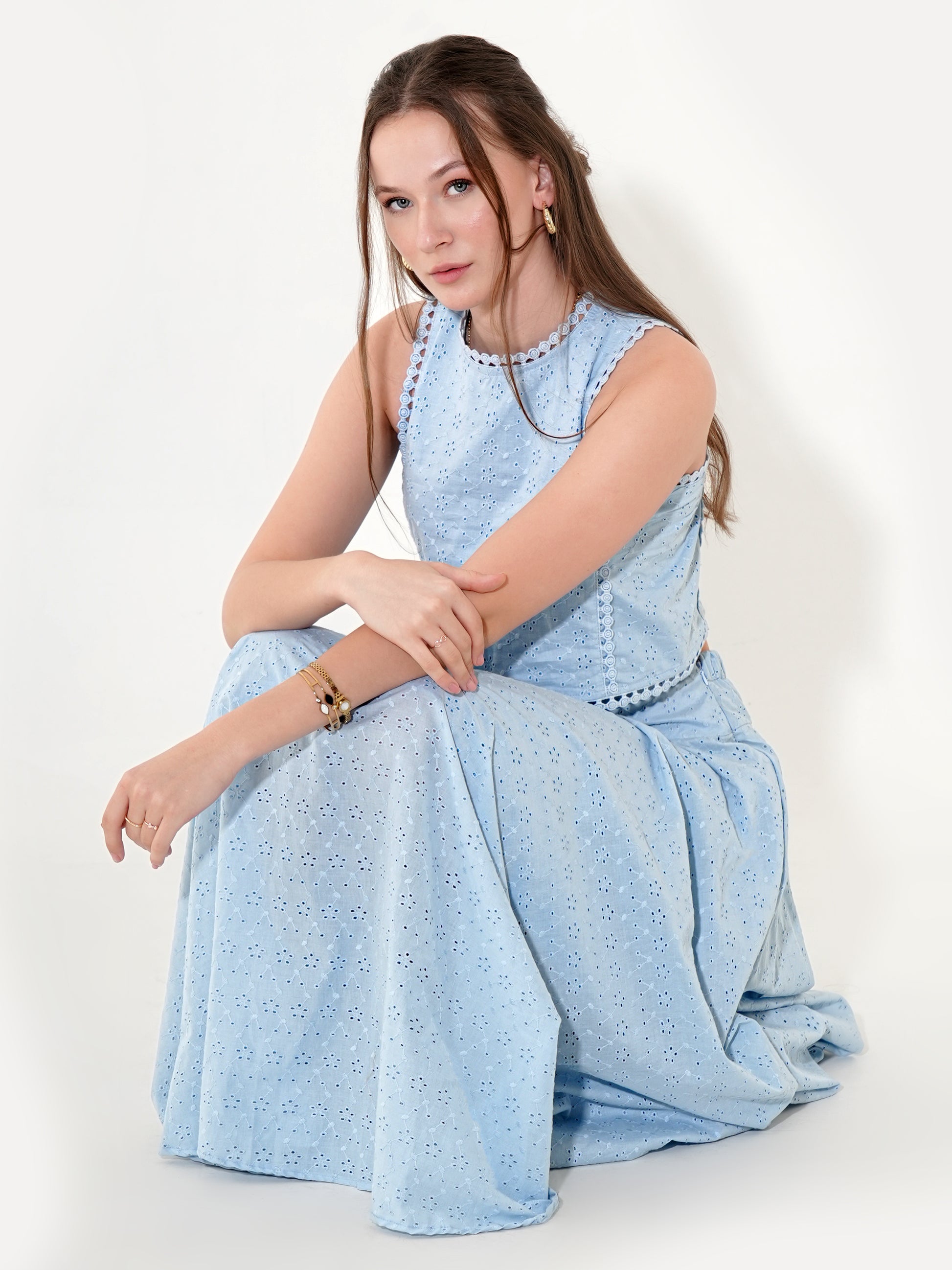 Lumi Co-ord Set is crafted from pure cotton, offering breathability and comfort with a refined touch. The intricate eyelet embroidery and delicate lace detailing add a sophisticated charm, making it a versatile staple for both day and evening wear. Featuring a sleeveless crop top with a scalloped hem and a flowy, high-waisted maxi skirt, this set blends sophistication with ease.