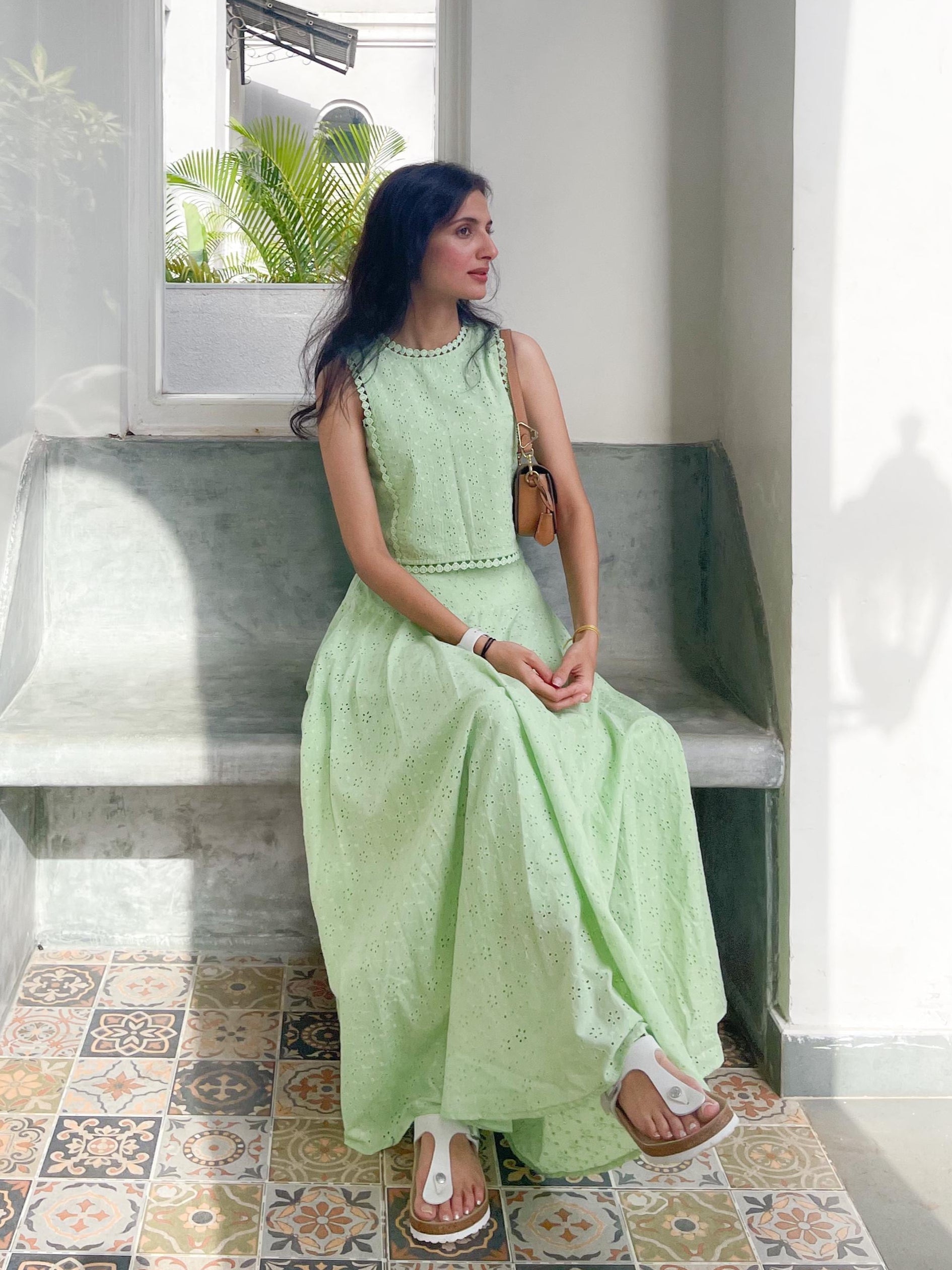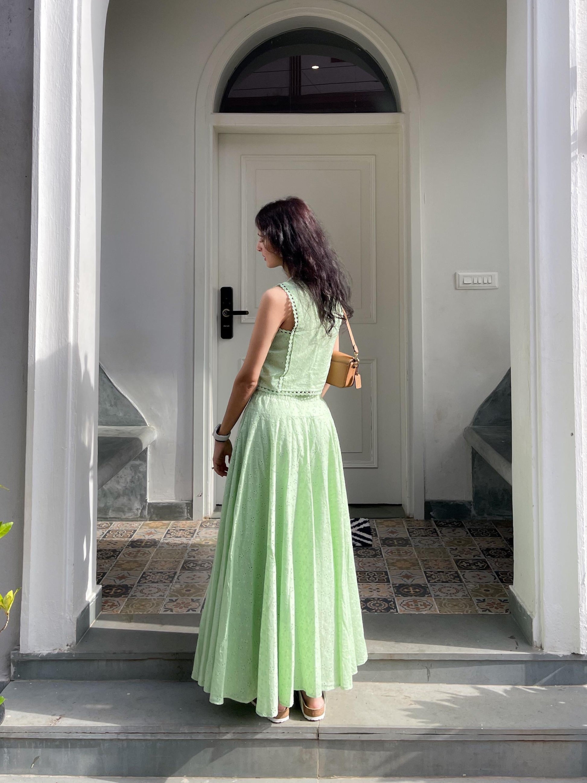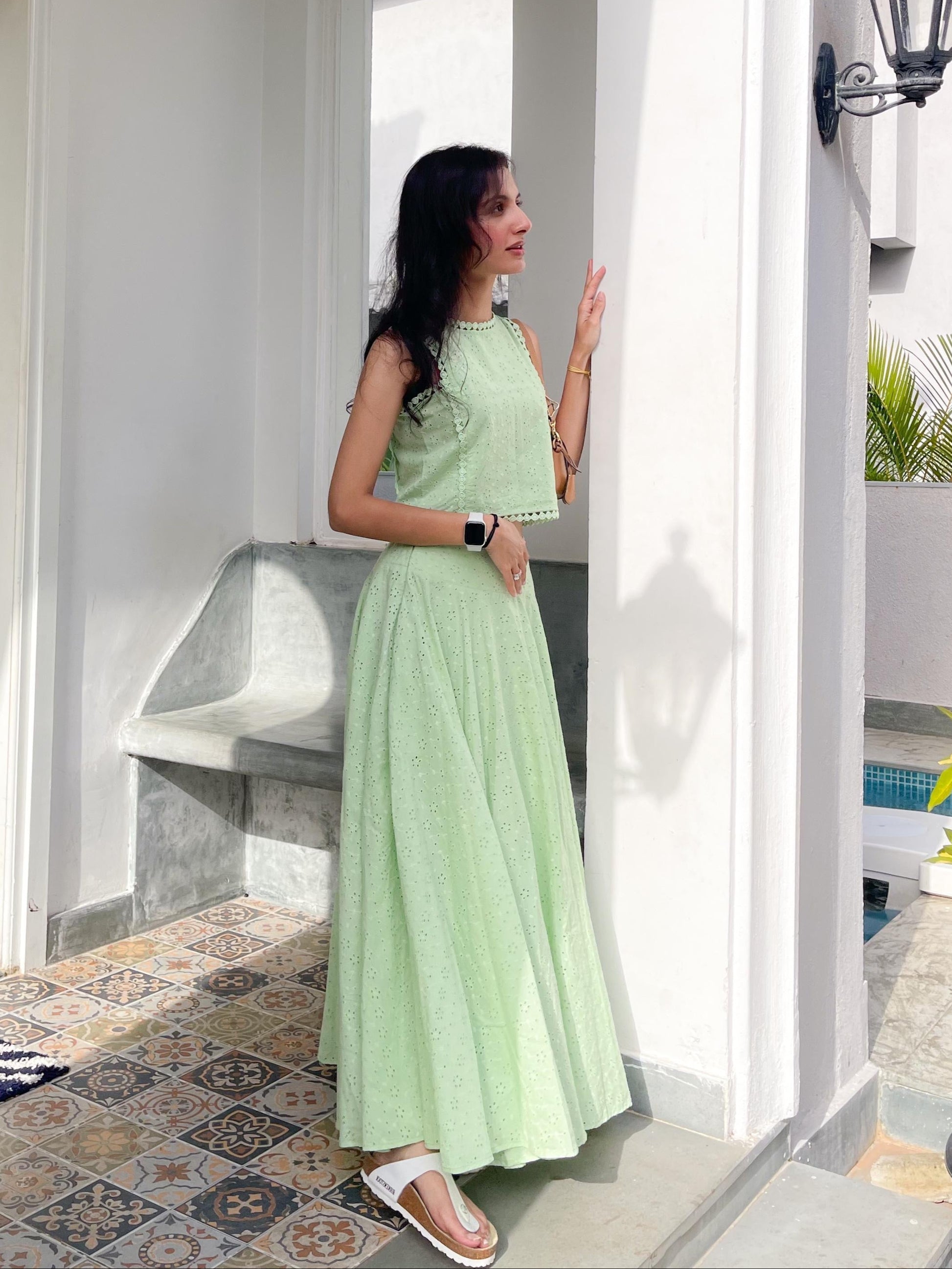 Lumi Co-ord Set is crafted from pure cotton, offering breathability and comfort with a refined touch. The intricate eyelet embroidery and delicate lace detailing add a sophisticated charm, making it a versatile staple for both day and evening wear. Featuring a sleeveless crop top with a scalloped hem and a flowy, high-waisted maxi skirt, this set blends sophistication with ease.
